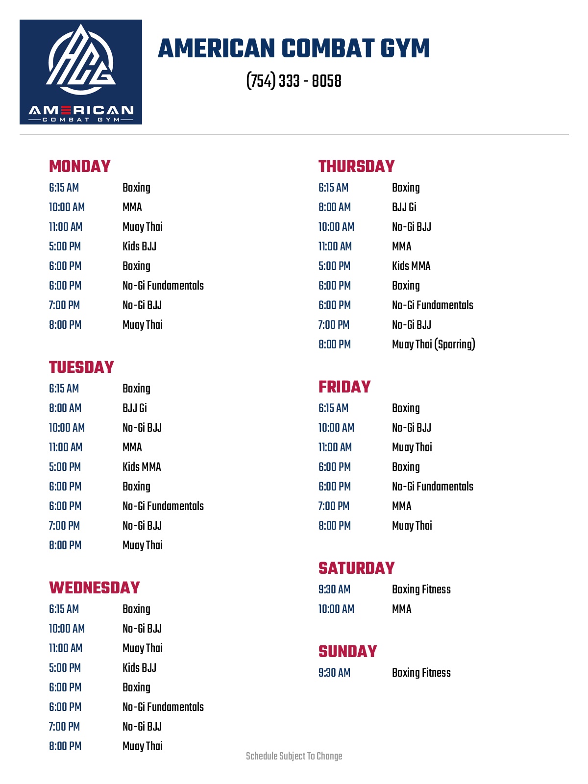 Note: Schedule is subject to change. Please check with the gym for the most up-to-date information.